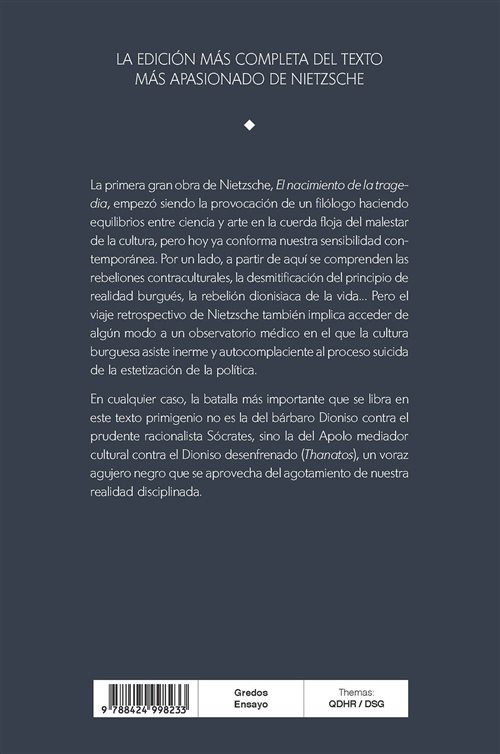 La primera gran obra de Nietzsche, El nacimiento de la tragedia, empezó siendo la provocación de un filólogo haciendo equilibrios entre ciencia y arte en la cuerda floja del malestar de la cultura, pero hoy ya conforma nuestra sensibilidad contemporánea. Por un lado, a partir de aquí se comprenden las rebeliones contraculturales, la desmitificación del principio de realidad burgués, la rebelión dionisiaca de la vida... Pero el viaje retrospectivo de Nietzsche también implica acceder de algún modo a un observatorio médico en el que la cultura burguesa asiste inerme y autocomplaciente al proceso suicida de la estetización de la política.