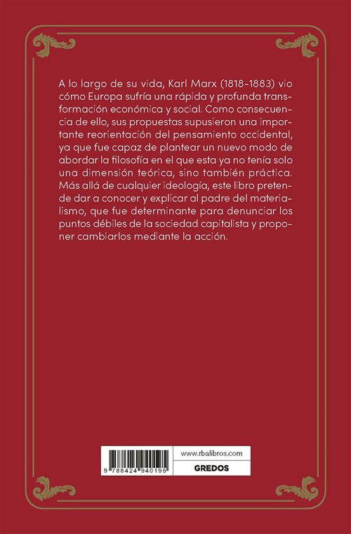 A lo largo de su vida, Karl Marx (1818-1883) vio cómo Europa sufría una rápida y profunda transformación económica y social. Como consecuencia de ello, sus propuestas supusieron una importante reorientación del pensamiento occidental, ya que fue capaz de plantear un nuevo modo de abordar la filosofía en el que esta ya no tenía solo una dimensión teórica, sino también práctica. Más allá de cualquier ideología, este libro pretende dar a conocer y explicar al padre del materialismo, que fue determinante para denunciar los puntos débiles de la sociedad capitalista y proponer cambiarlos mediante la acción.