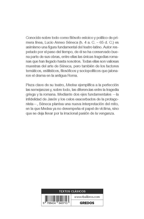 Conocido sobre todo como filósofo estoico y político de primera línea, Lucio Anneo Séneca (h. 4 a. C. – 65 d. C.) es asimismo una figura fundamental del teatro latino. Autor respetado por el paso del tiempo, de él se ha conservado buena parte de sus obras, entre ellas las únicas tragedias romanas que han llegado hasta nosotros. Todas ellas son valiosas muestras del arte de Séneca, pero también de los factores temáticos, estilísticos, filosóficos y sociopolíticos que jalonaron el drama en la antigua Roma.