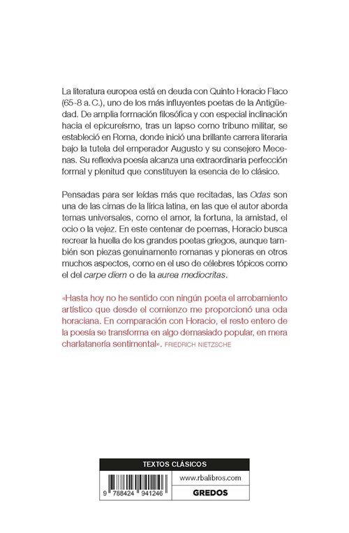 Pensadas para ser leídas más que recitadas, las Odas son una de las cimas de la lírica latina, en las que el autor aborda temas universales, como el amor, la fortuna, la amistad, el ocio o la vejez. En este centenar de poemas, Horacio busca recrear la huella de los grandes poetas griegos, aunque también son piezas genuinamente romanas y pioneras en otros muchos aspectos, como en el uso de célebres tópicos como el del carpe diem o de la aurea mediocritas.