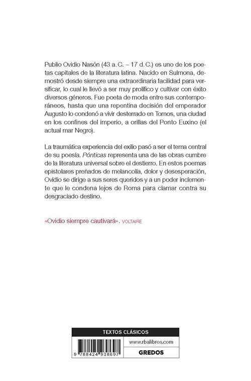La traumática experiencia del exilio pasó a ser el tema central de su poesía. Pónticas representa una de las obras cumbre de la literatura universal sobre el destierro. En estos poemas epistolares preñados de melancolía, dolor y desaparición, Ovidio se dirige a sus seres queridos y a un poder inclemente que le condena lejos de Roma para clamar contra desgraciado destino.