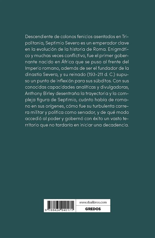 Descendiente de colonos fenicios asentados en Tripolitania, Septimio Severo es un emperador clave en la evolución de la historia de Roma. Enigmático y muchas veces conflictivo, fue el primer gobernante nacido en África que se puso al frente del Imperio romano, ademas de ser el fundador de la dinastía Severa, y su reinado (193-211 d. C.) supuso un punto de inflexión para sus súbditos. Con sus conocidas capacidades analíticas y divulgadores, Anthony Birley desentraña la trayectoria y la compleja figura de Septimio, cuánto había de romano en sus orígenes, cómo fue su turbulenta carrera militar y política como senador, y de qué modo accedió al poder y gobernó con éxito un vasto territorio que no tardaría en iniciar una decadencia.