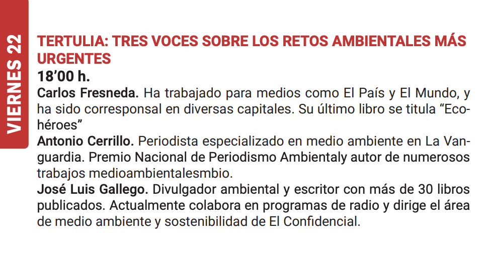 Carlos Fresneda formará parte de la tertulia Tres voces sobre los retos ambientales más urgentes este viernes 22 de diciembre a las 18h, dentro del BioculturaON. El autor de ‘Ecohéroes' conversará con los periodistas especializados en medio ambiente Antonio Cerrillo y José Luis Gallego. Este coloquio se enmarca dentro de la celebración del BioculturaON, que este año estrena un nuevo formato de evento virtual que reproduce la esencia de la feria BioCultura y que, además, cuenta con una gran variedad de actividades y una zona de exposición virtual interactiva.