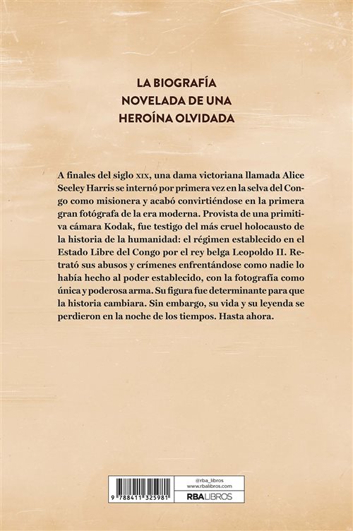 A finales del siglo XIX, una dama victoriana llamada Alice Seeley Harris se internó por primera vez en la selva del Congo como misionera y acabó convirtiéndose en la primera gran fotógrafa de la era moderna. Provista de una primitiva cámara Kodak, fue testigo del más cruel holocausto de la historia de la humanidad: el régimen establecido en el Estado Libre del Congo por el rey belga Leopoldo II. Retrató sus abusos y crímenes enfrentándose como nadie lo había hecho al poder establecido, con la fotografía como única y poderosa arma. Su figura fue determinante para que la historia cambiara. Sin embargo, su vida y su leyenda se perdieron en la noche de los tiempos. Hasta ahora.