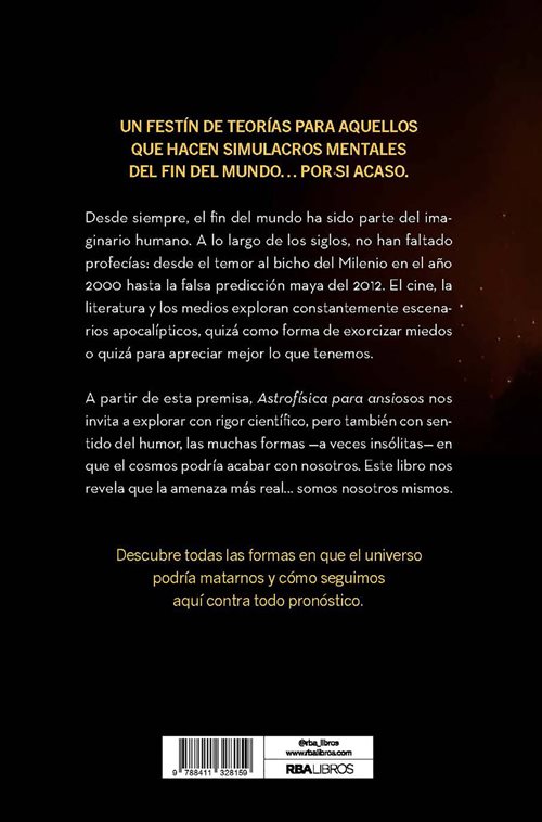 A partir de esta premisa, Astrofísica para ansiosos nos invita a explorar con rigor científico, pero también con sentido del humor, las muchas formas —a veces insólitas— en que el cosmos podría acabar con nosotros. Este libro nos revela que la amenaza más real... somos nosotros mismos.