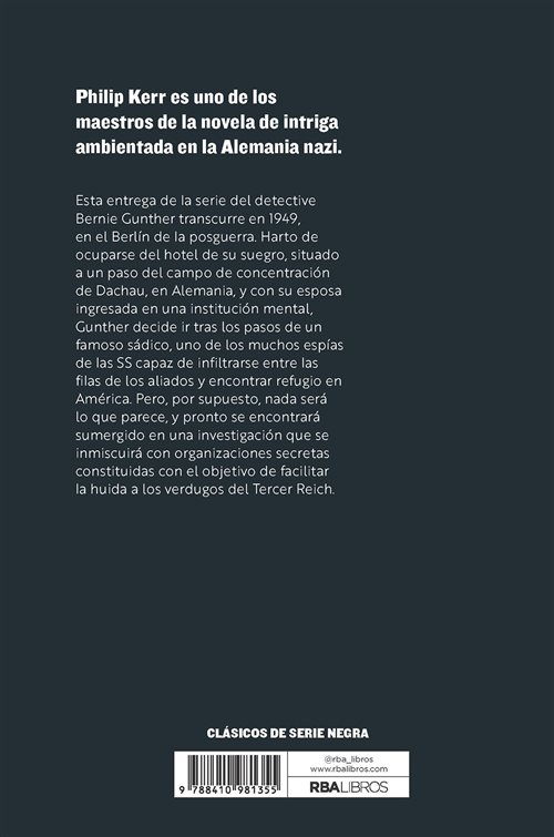 Esta entrega de la serie del detective Bernie Gunther transcurre en 1949, en el Berlín de la posguerra. Harto de ocuparse del hotel de su suegro, situado a un paso del campo de concentración de Dachau, en Alemania, y con su esposa ingresada en una institución mental, Gunther decide ir tras los pasos de un famoso sádico, uno de los muchos espías de las SS capaz de infiltrarse entre las filas de los aliados y encontrar refugio en América. Pero, por supuesto, nada será lo que parece, y pronto se encontrará sumergido en una investigación que se inmiscuirá con organizaciones secretas constituidas con el objetivo de facilitar la huida a los verdugos del Tercer Reich.