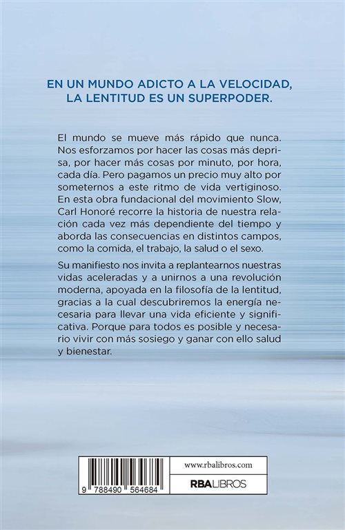 El mundo se mueve más rápido que nunca. Nos esforzamos por hacer las cosas más deprisa, por hacer más cosas por minuto, por hora, cada día. Pero pagamos un precio muy alto por someternos a este ritmo de vida vertiginoso. En esta obra fundacional del movimiento Slow, Carl Honoré recorre la historia de nuestra relación cada vez más dependiente del tiempo y aborda las consecuencias en distintos campos, como la comida, el trabajo, la salud o el sexo. Su manifiesto nos invita a replantearnos nuestras vidas aceleradas y a unirnos a una revolución moderna, apoyada en la filosofía de la lentitud, gracias a la cual descubriremos la energía necesaria para llevar una vida eficiente y significativa. Porque para todos es posible y necesario vivir con más sosiego y ganar con ello salud y bienestar.