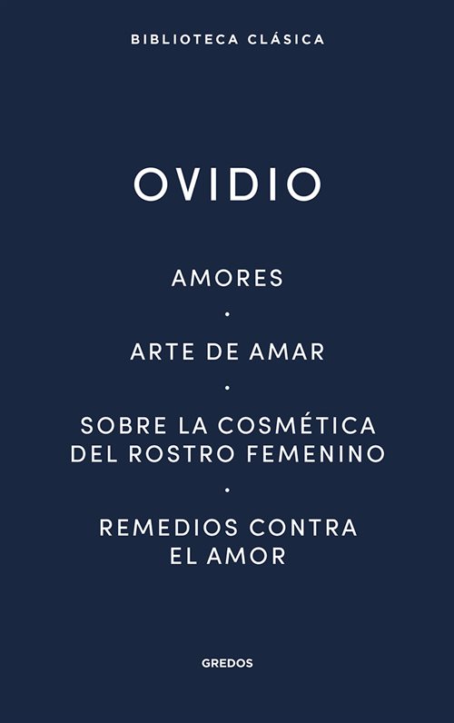 Publicado originalmente en la BCG con el número 120, este volumen presenta las traducciones de Amores, Arte de amar, Sobre la cosmética del rostro femenino y Remedios contra el amor, realizadas por Vicente Cristóbal López (Universidad Complutense de Madrid). La introducción ha sido actualizada por él mismo para esta edición.