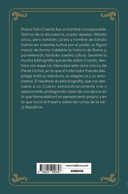 Marco Tulio Cicerón fue un hombre incomparable. Teórico de la elocuencia, orador excelso, filósofo único, pero también jurista y hombre de Estado metido en violentas luchas por el poder, su figura marcó de forma indeleble la historia de Roma y, por extensión, también nuestra cultura. De entre la mucha bibliografía que existe sobre Cicerón, destaca con especial intensidad esta obra icónica de Pierre Grimal, en la que el historiador francés despliega toda su sabiduría, su elegancia y su entusiasmo. El resultado es esta biografía, que nos descubre a un Cicerón extraordinariamente vivo y apasionante, protagonista clave de una época en la que Roma elaboró un pensamiento propio, y en la que nació el Imperio sobre las ruinas de la vieja República