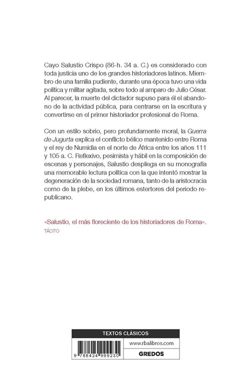 Con un estilo sobrio, pero profundamente moral, la Guerra de Jugurta explica el conflicto bélico mantenido entre Roma y el rey de Numidia en el norte de África entre los años 111 y 105 a.n.e. Reflexivo, pesimista y hábil en la composición de escenas y personajes, Salustio despliega en su monografía una memorable lectura política con la que intentó mostrar la degeneración de la sociedad romana, tanto de la aristocracia como de la plebe, en los últimos estertores del período republicano.