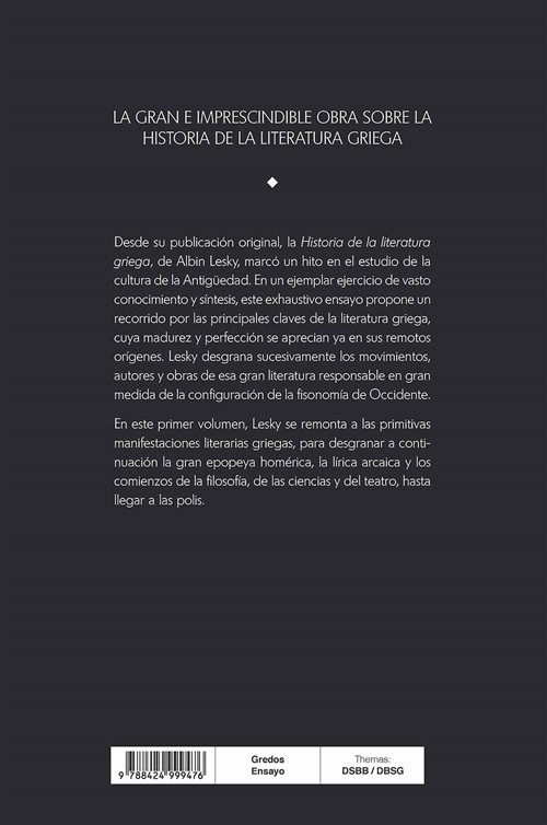Desde su publicación original, la Historia de la literatura griega, de Albin Lesky, marcó un hito en el estudio de la cultura de la Antigüedad. En un ejemplar ejercicio de vasto conocimiento y síntesis, este exhaustivo ensayo propone un recorrido por las principales claves de la literatura griega, cuya madurez y perfección se aprecian ya en sus remotos orígenes. Lesky desgrana sucesivamente los movimientos, autores y obras de esa gran literatura responsable en gran medida de la configuración de la fisonomía de Occidente.