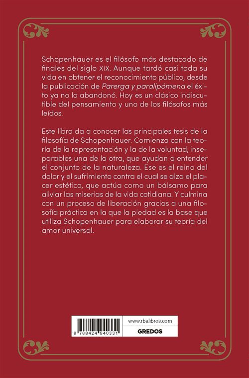 Este libro da a conocer las principales tesis de la filosofía de Schopenhauer. Comienza con la teoría de la representación y la de la voluntad, inseparables una de la otra, que ayudan a entender el conjunto de la naturaleza. Ese es el reino del dolor y el sufrimiento contra el cual se alza el placer estético, que actúa como un bálsamo para aliviar las miserias de la vida cotidiana. Y culmina con un proceso de liberación gracias a una filosofía práctica en la que la piedad es la base que utiliza Schopenhauer para elaborar su teoría del amor universal.