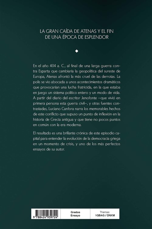 En el año 404 a. C., al final de una larga guerra contra Esparta que cambiaría la geopolítica del sureste de Europa, Atenas afrontó la más cruel de las derrotas. La polis se vio abocada a unos acontecimientos dramáticos que provocarían una lucha fratricida, en la que estaba en juego un sistema político entero y un modo de vida. A partir del diario del escritor Jenofonte —que vivió en primera persona esta guerra civil—, y otras fuentes contrastadas, Luciano Canfora narra los memorables hechos de este conflicto que supuso un punto de inflexión en la historia de Grecia antigua y que tiene no pocos puntos en común con la era moderna.