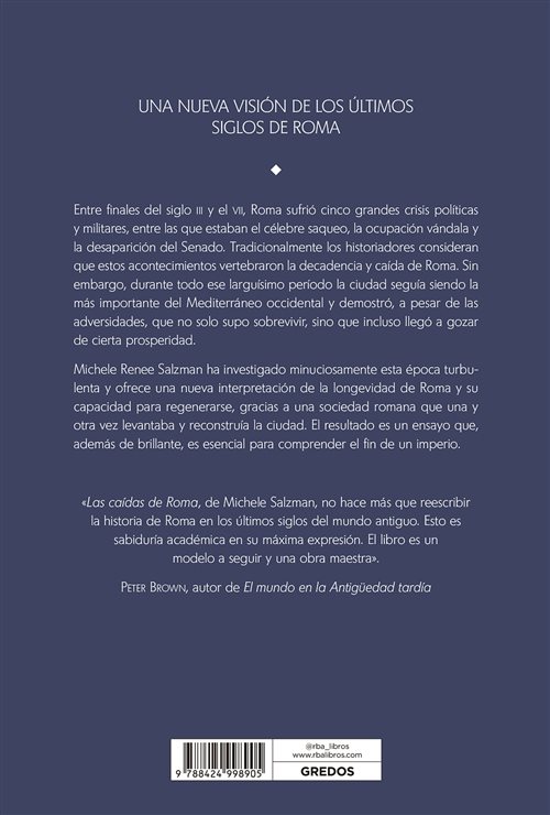 «Las caídas de Roma, de Michele Salzman, no hace más que reescribir la historia de Roma en los últimos siglos del mundo antiguo. Basándose en una minuciosa atención a las evidencias de todo tipo, su relato ofrece una nueva perspectiva sobre casi todos los aspectos del destino de esta vasta ciudad y de las familias notables que se unieron una y otra vez para rescatarla y regenerarla tras cada crisis. Esto es sabiduría académica en su máxima expresión. El libro es un modelo a seguir y una obra maestra». Peter Brown, autor de El mundo en la Antigüedad tardía.