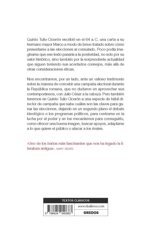 Nos encontramos, por un lado, ante un valioso testimonio sobre la manera de concebir una campaña electoral durante la República romana, que no dudaron en aprovechar sus contemporáneos, con Julio César a la cabeza. Pero también tenemos en Quinto Tulio Cicerón a una especie de hábil director de campaña que sabe cuáles son las claves para ganar las elecciones, dejando en un segundo plano el debate ideológico o los programas políticos, para centrarse en la lucha por el poder y en los mecanismos para conseguirlo, como ofrecer una buena imagen, buscar apoyos, adaptarse a lo que quiere el público o atacar a los rivales.