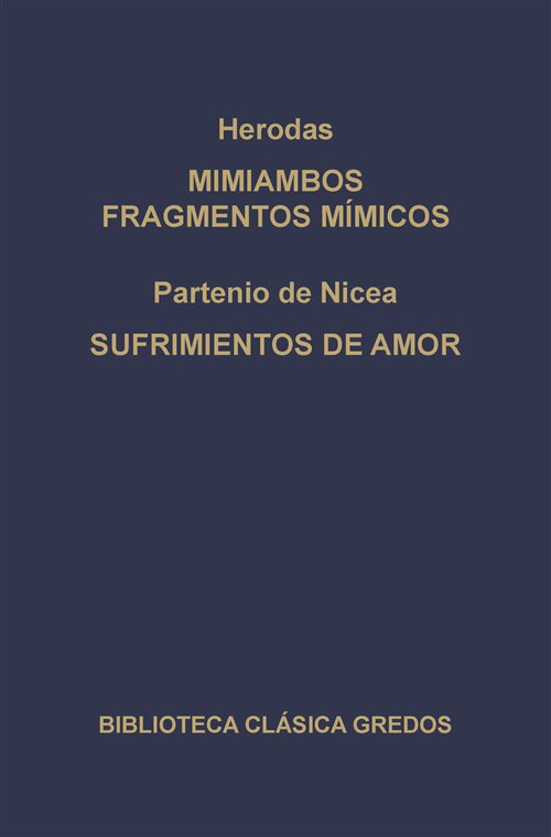 Dos compilaciones de personajes y caracteres: una de tipos de comedia extraídos de la tradición mímica y otra de aventuras amorosas pertenecientes a la mitología.Herodas, tal vez de Cos, es un poeta helenístico (siglo III a.C.) que se sirve de la tradición mímica para componer breves cuadros de costumbres con un refinado arte y un efecto literario propio. Los miniambos nos presentan escenas y tipos propios de la comedia y del entremés. Personajes prototípicos como el maestro de escuela, la alcahueta, el zapatero y el amo de burdel parecen brotar de las calles de una ciudad helenística, de Cos o de Alejandría. El poeta se muestra atento a los vocablos precisos y populares, y caricaturiza a los personajes mediante su propia forma de hablar. Compuestos en una lengua de colorido jonio, estos poemas son una muestra singular del arte helenístico en su faceta de pintura de tipos y escenas populares.El volumen se completa con Sufrimientos de amor, de Paternio de Nicea, gramático y poeta alejandrino del siglo I a.C., de quien apenas conservamos escritos, pero que según Macrobio fue el maestro de Virgilio, y que gozó de enorme éxito entre los romanos (como muchos otros griegos cultos de la época, se trasladó a la capital, donde entró en contacto con los cenáculos poéticos latinos). Es el eslabón final de la multiforme poesía helenística, en la que lo erudito tiene un papel primordial. Los Sufrimientos son una colección de narraciones cortas, treinta y seis, sobre aventuras amorosas desastrosas y peripecias mitológicas extraídas de autores antiguos y compiladas para formar un manual destinado a la composición de poesía elegíaca.