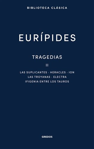 El segundo tomo de las tragedias completas de Eurípides en la Biblioteca Clásica reúne las obras: Las suplicantes, Heracles, Ion, Las troyanas, Electra e Ifigenia entre los tauros.