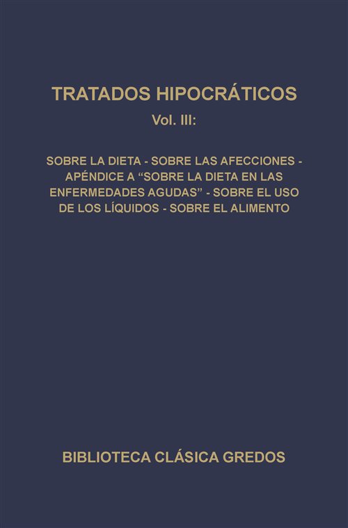 Este hito histórico de la filología clásica, la traducción íntegra de los Tratados hipocráticos, es una ocasión única no sólo para los interesados en el nacimiento y la evolución de la ciencia médica, sino para cualquier amante de la cultura griega.El Corpus Hippocraticum es un conjunto de más de cincuenta tratados médicos de enorme importancia, pues constituyen los textos fundacionales de la ciencia médica europea y forman la primera biblioteca científica de Occidente. Casi todos se remontan a finales del siglo V y comienzos del IV a.C., la época en que vivieron Hipócrates y sus discípulos directos. No sabemos cuántos de estos escritos son del «Padre de la Medicina», pero todos muestran una orientación coherente e ilustrada, racional y profesional, que bien puede deberse al maestro de Cos. Más importante que la debatida cuestión de la autoría es comprender el alcance de esta medicina, su empeño humanitario y su afán metódico. Este corpus resulta esencial no sólo para la historia de la ciencia médica, sino para el conocimiento cabal de la cultura griega.Éste es el primer intento de verter al castellano todos estos tratados, y se ha hecho con el mayor rigor filológico: se ha partido de las ediciones más recientes y contrastadas de los textos griegos, se han anotado las versiones a fin de aclarar cualquier dificultad científica o lingüística y se han añadido introducciones a cada uno de los tratados, con lo cual se incorpora una explicación pormenorizada a la Introducción General, que sitúa el conjunto de los escritos en su contexto histórico.El tercer volumen de los Tratados hipocráticos incluye los textos «Sobre la dieta», «Sobre las afecciones», «Apéndice a "Sobre la dieta en las enfermedades agudas"», «Sobre el uso de los líquidos» y «Sobre el alimento».