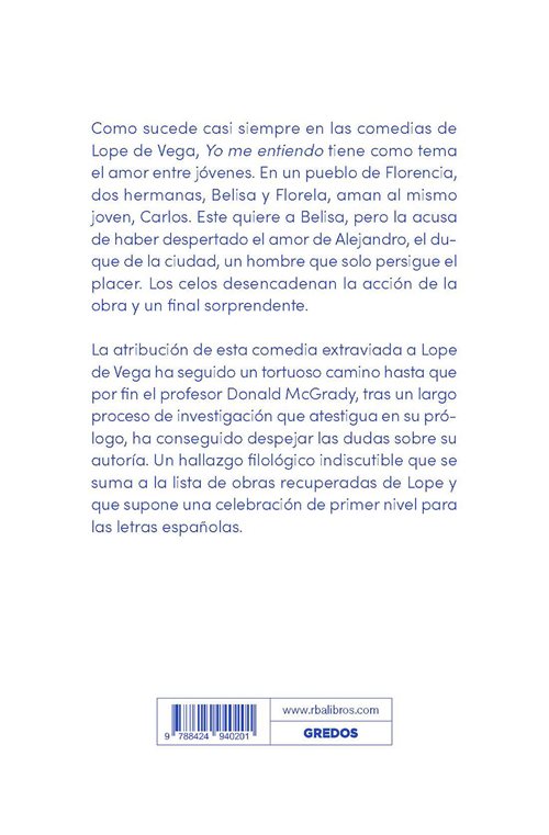 Como sucede casi siempre en las comedias de Lope de Vega, Yo me entiendo tiene como tema el amor entre jóvenes. En un pueblo de Florencia, dos hermanas, Belisa y Florela, aman al mismo joven, Carlos. Este quiere a Belisa, pero la acusa de haber despertado el amor de Alejandro, el duque de la ciudad, un hombre que solo persigue el placer. Los celos desencadenan la acción de la obra y un final sorprendente.