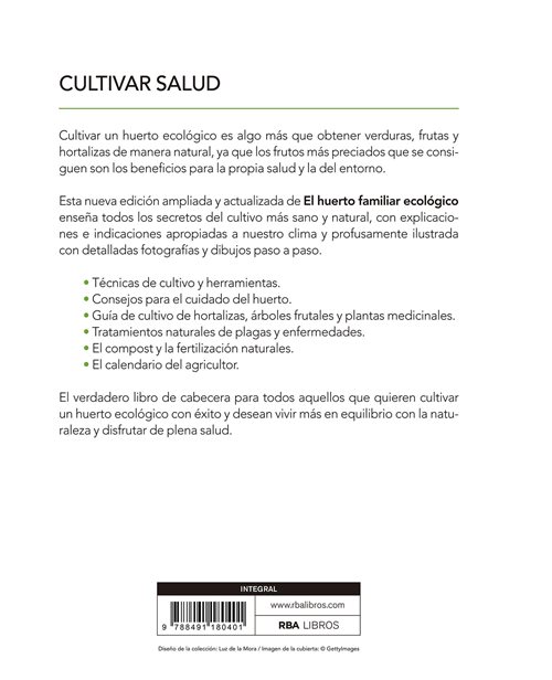Cultivar un huerto ecológico es algo más que obtener verduras, frutas y hortalizas de manera natural. Los frutos que de un cultivo así conseguimos, son los más beneficiosos para la salud, la nuestra y la de nuestro entorno. Esta nueva edición ampliada y actualizada de El huerto familiar ecológico enseña todos los secretos del cultivo más sano y natural,con explicaciones e indicaciones apropiadas a nuestro clima y profusamente ilustrada con detalladas fotografías y dibujos paso a paso. En ella encontrarás las principales técnicas de cultivo y herramientas, consejos para el cuidado del huerto, una completa guía de cultivo de hortalizas, árboles frutales y plantas medicinales, tratamientos naturales para combatir plagas y enfermedades, cómo crear tu compost y fertilizantes naturales, así como un útil calendario del agricultor. El verdadero libro de cabecera para todos aquellos que quieren cultivar un huerto ecológico con éxito y desean vivir más en equilibrio con la naturaleza y disfrutar de plena salud.