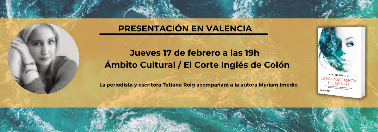 La autora Myriam Imedio presentará el próximo jueves 17 de febrero su última libro La isla más remota del mundo en Valencia. Durante el acto, que tendrá lugar en Ámbito Cultural de El Corte Inglés de Colón (6ª Planta), la autora conversará con la periodista y escritora Tatiana Roig. Después de dos novelas más que prometedoras, Myriam Imedio irrumpe con fuerza en el panorama de la novela negra con La isla más remota del mundo, un thriller psicológico vertiginoso con una protagonista memorable en constante huida.