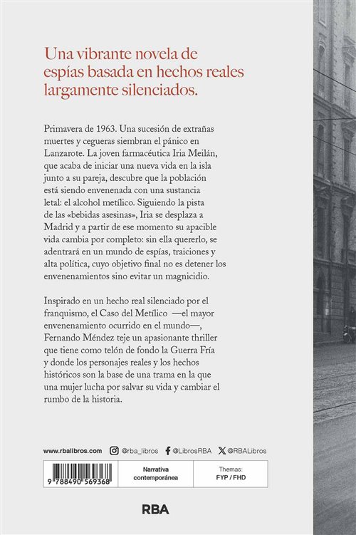 Inspirado en un hecho real silenciado por el franquismo, el conocido como Caso del Metílico —el mayor envenenamiento ocurrido en el mundo—, Fernando Méndez teje un apasionante thriller donde los personajes reales y los hechos históricos son la base de una conmovedora trama en la que una mujer corriente lucha contra reloj no solo por salvar su vida, sino también por cambiar el rumbo de la historia.