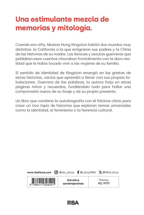 El sentido de identidad de Kingston emergió en las grietas de estas historias, vacíos que aprendió a llenar con sus propias fabulaciones. Guerrera de las palabras, la autora forja en estas páginas mitos y recuerdos, fundiéndolo todo para hallar una comprensión nueva de su linaje y de su propio presente.