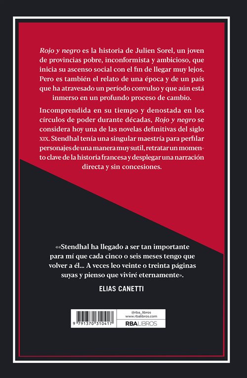Incomprendida en su tiempo y denostada en los círculos de poder durante décadas, Rojo y negro se considera hoy una de las novelas definitivas del siglo XIX. Stendhal tenía una singular maestría para perfilar personajes de una manera muy sutil, retratar un momento clave de la historia francesa y desplegar una narración directa y sin concesiones.