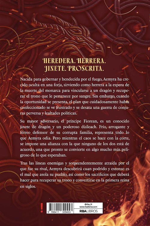 Nacida para gobernar y bendecida por el fuego, Aemyra ha crecido oculta en una forja, sirviendo como herrera a la espera de la muerte del monarca para vincularse a un dragón y recuperar el trono que le pertenece por sangre. Sin embargo, cuando la oportunidad se presenta, el plan que cuidadosamente había confeccionado se ve frustrado y se desata una guerra de conjuras perversa y lealtades políticas.