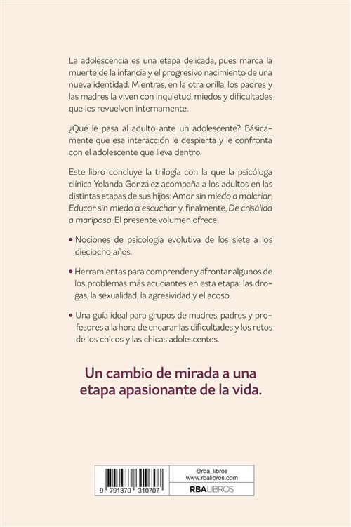 Este libro concluye la trilogía con la que la psicóloga clínica Yolanda González acompaña a los adultos en las distintas etapas de sus hijos: Amar sin miedo a malcriar, Educar sin miedo a escuchar y, finalmente, De crisálida a mariposa. El presente volumen ofrece: