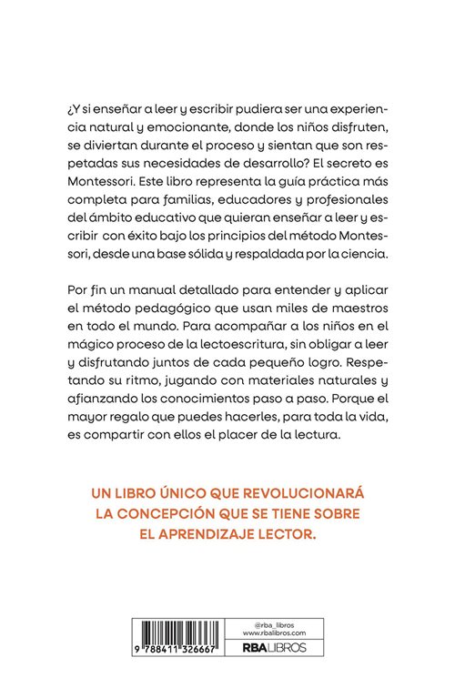 Por fin un manual detallado para entender y aplicar el método pedagógico que usan miles de maestros en todo el mundo. Para acompañar a los niños en el mágico proceso de la lectoescritura, sin obligar a leer y disfrutando juntos de cada pequeño logro. Respetando su ritmo, jugando con materiales naturales y afianzando los conocimientos paso a paso. Porque el mayor regalo que puedes hacerles, para toda la vida, es compartir con ellos el placer de la lectura.