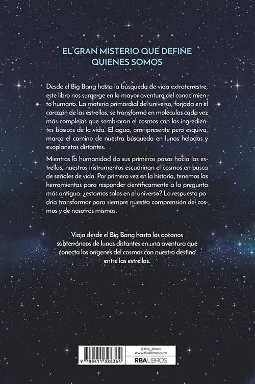 Desde el Big Bang hasta la búsqueda de vida extraterrestre, este libro nos sumerge en la mayor aventura del conocimiento humano. La materia primordial del universo, forjada en el corazón de las estrellas, se transformó en moléculas cada vez más complejas que sembraron el cosmos con los ingredientes básicos de la vida. El agua, omnipresente pero esquiva, marca el camino de nuestra búsqueda en lunas heladas y exoplanetas distantes. Mientras la humanidad da sus primeros pasos hacia las estrellas, nuestros instrumentos escudriñan el cosmos en busca de señales de vida. Por primera vez en la historia, tenemos las herramientas para responder científicamente a la pregunta más antigua: ¿estamos solos en el universo? La respuesta podría transformar para siempre nuestra comprensión del cosmos y de nosotros mismos.