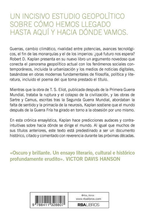 Robert D. Kaplan presenta en su nuevo libro un argumento novedoso que conecta el panorama geopolítico actual con los fenómenos sociales contemporáneos, incluida la urbanización y los medios de noticias digitales, basándose en obras modernas fundamentales de filosofía, política y literatura, incluido el poema del que toma prestado el título.
