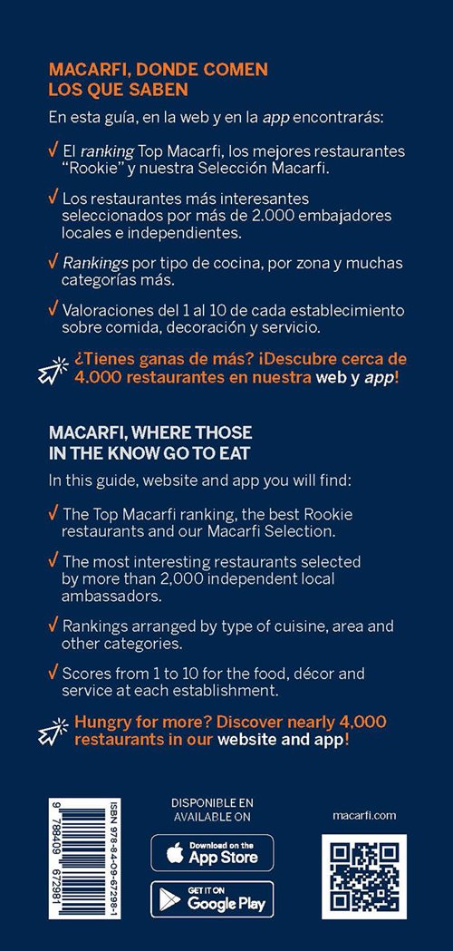 Macarfi presenta la décima edición de su guía de restaurantes. La Guía Macarfi recoge los 360 restaurantes más interesantes de Cataluña, la Comunidad de Madrid, País Vasco, La Rioja, la Comunidad Valenciana, Andalucía, Cantabria y el Principado de Asturias. La nueva edición ofrece los Top 100 de Cataluña, Comunidad de Madrid, País Vasco, Comunidad Valenciana y Andalucía y los Top 50 de las demás comunidades autónomas. Asimismo, aparecen los Rookies Macarfi 2024. También hay numerosos listados en los que se clasifican los restaurantes por tipo de cocina, zona, decoración, servicio o buenos por (aquí comen los locales, bodega, buen menú, bravas, para grupos, para niños y muchos más). En los listados se incluyen los restaurantes existentes en la web y en la app. La guía está en dos idiomas: castellano e inglés.