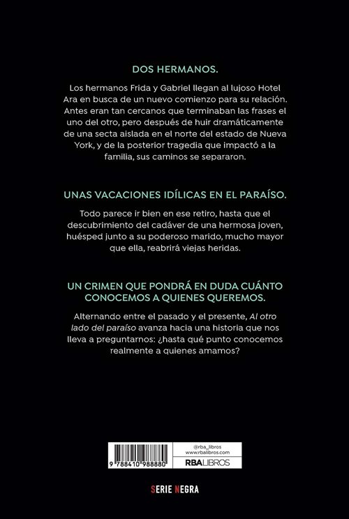 UNAS VICAS EN EL PARAÍSO. Todo parece ir bien en ese retiro, hasta que el descubrimiento del cadáver de una hermosa joven, huésped junto a su poderoso marido, mucho mayor que ella, reabrirá viejas heridas. UN CRIMEN QUE PONDRÁ EN DUDA CUÁNTO CONOCEMOS A QUIENES QUEREMOS. Alternando entre el pasado y el presente, Al otro lado del paraíso avanza hacia una historia que nos lleva a preguntarnos: ¿hasta qué punto conocemos realmente a quienes amamos?