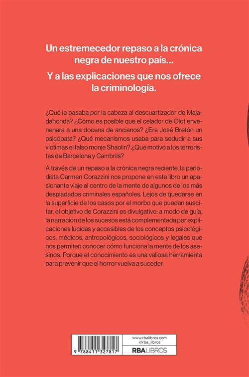 A través de un repaso a la crónica negra reciente, la periodista Carmen Corazzini nos propone en este libro un apasionante viaje al centro de la mente de algunos de los más despiadados criminales españoles. Lejos de quedarse en la superficie de los casos por el morbo que puedan suscitar, el objetivo de Corazzini es divulgativo: a modo de guía, la narración de los sucesos está complementada por explicaciones lúcidas y accesibles de los conceptos psicológicos, médicos, antropológicos, sociológicos y legales que nos permiten conocer cómo funciona la mente de los asesinos. Porque el conocimiento es una valiosa herramienta para prevenir que el horror vuelva a suceder.