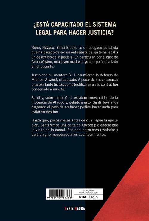 Reno, Nevada. Santi Elcano es un abogado penalista que ha pasado de ser un entusiasta del sistema legal a un descreído de la justicia. En particular, por el caso de Anna Weston, una joven madre cuyo cuerpo fue hallado en el desierto.