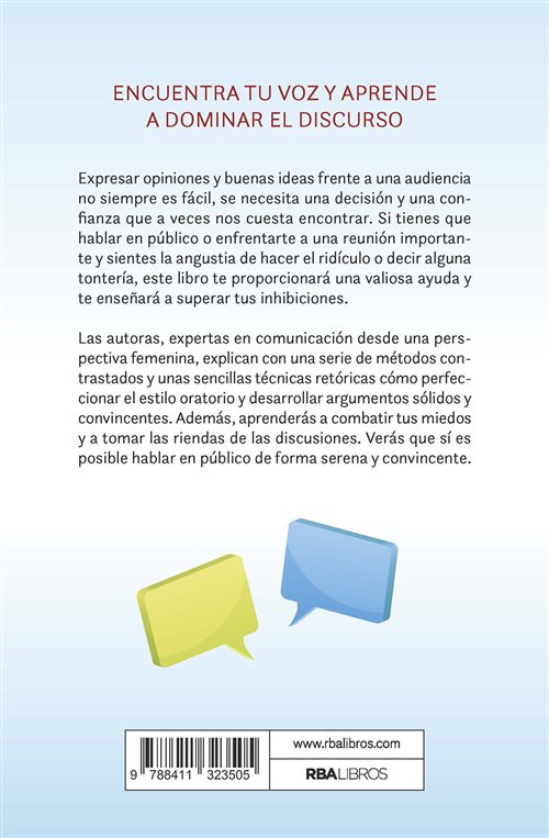 Las autoras expertas en comunicación desde una perspectiva femenina, explican con una serie de métodos contrastados y unas sencillas técnicas retóricas cómo perfeccionar el estilo oratorio y desarrollar argumentos sólidos y convincentes. Además, aprenderás a combatír tus miedos y a tomar las riendas de las discusiones. Verás que sí es posible hablar en público de forma serena y convincente.