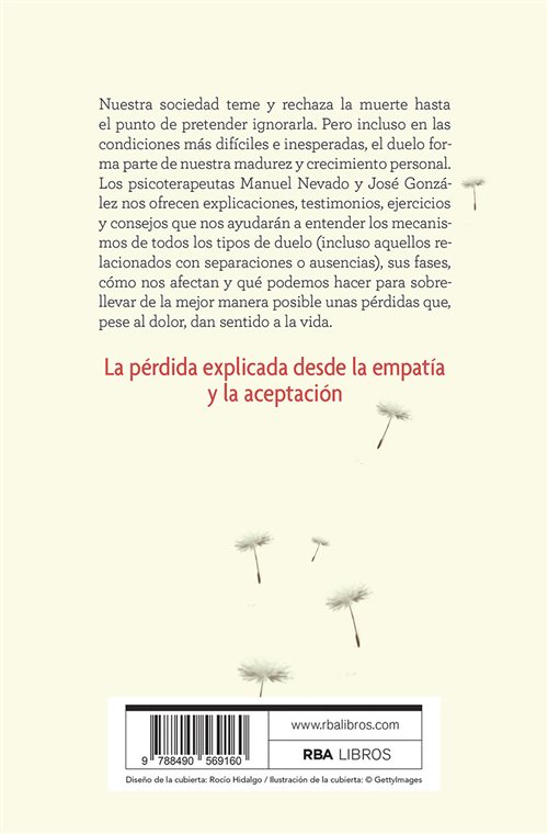Nuestra sociedad teme y rechaza la muerte hasta el punto de pretender ignorarla. Pero incluso en las condiciones más difíciles e inesperadas, el duelo forma parte de nuestra madurez y crecimiento personal. Los psicoterapeutas Manuel Nevado y José González nos ofrecen explicaciones, testimonios, ejercicios y consejos que nos ayudarán a entender los mecanismos de todos los tipos de duelo (incluso aquellos relacionados con separacioines o ausencias), sus fases, cómo nos afectan y qué podemos hacer para sobrellevar de la mejor manera posible unas pérdidas que, pese al dolor, dan sentido a la vida.