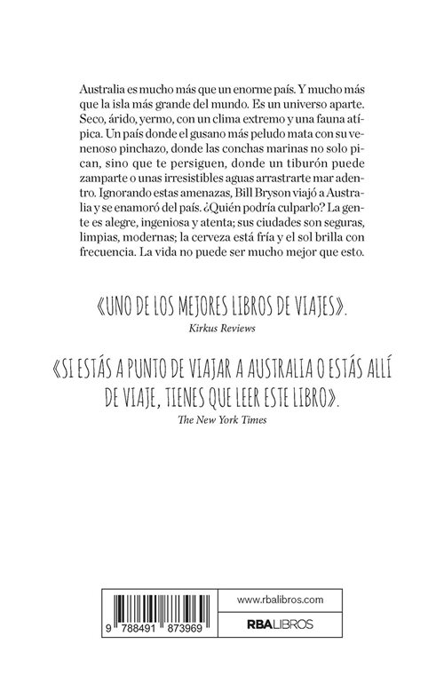 Australia es mucho más que un enorme país. Y mucho más que la isla más grande del mundo. Es un universo aparte. Seco, árido, yermo, con un clima extremo y una fauna atípica. Un país donde el gusano más peludo mata con su venenoso pinchazo, donde las conchas marinas no solo pican, sino que te persiguen, donde un tiburón puede zamparte o unas irresistibles aguas arrastrarte mar adentro. Ignorando estas amenazas, Bill Bryson viajó a Australia y se enamoró del país. ¿Quién podría culparlo? La gente es alegre, ingeniosa y atenta; sus ciudades son seguras, limpias, modernas; la cerveza está fría y el sol brilla con frecuencia. La vida no puede ser mucho mejor que esto.