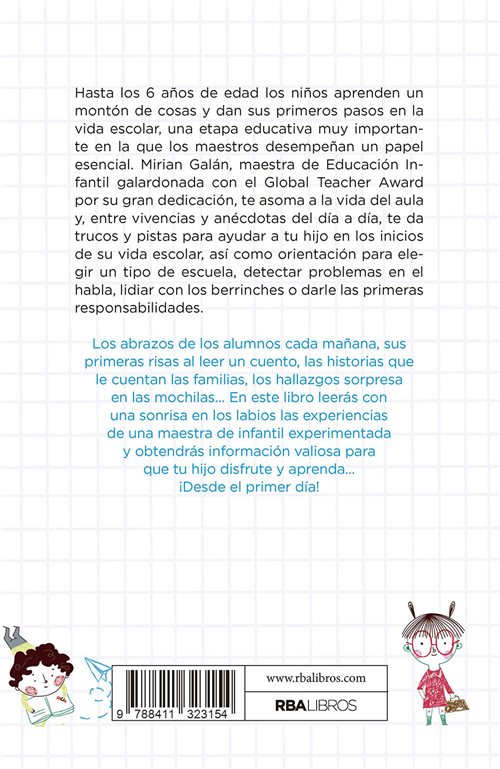 Hasta los 6 años de edad los niños aprenden un montón de cosas y dan sus primeros pasos en la vida escolar, una etapa educativa muy importante en la que los maestros desempeñan un papel esencial. Mirian Galán, maestra de Educación Infantil galardonada con el Global Teacher Award por su gran dedicación, te asoma a la vida del aula y, entre vivencias y anécdotas del día a día, te da trucos y pistas para ayudar a tu hijo en los inicios de su vida escolar, así como orientación para elegir un tipo de escuela, detectar problemas en el habla, lidiar con los berrinches o darle las primeras responsabilidades.