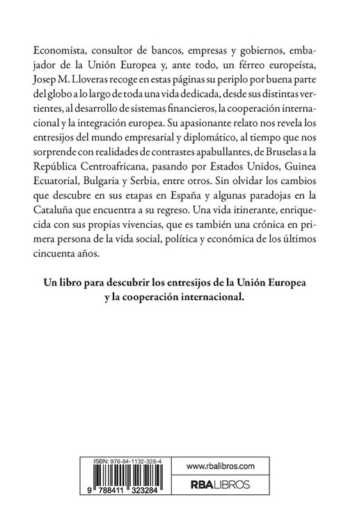 Economista, consultor de bancos, empresas y gobiernos, embajador de la Unión Europea y, ante todo, un férreo europeísta, Josep M. Lloveras recoge en estas páginas su periplo por buena parte del globo a lo largo de toda una vida dedicada, desde sus distintas vertientes, al desarrollo de sistemas financieros, la cooperación internacional y la integración europea. Su apasionante relato nos revela los entresijos del mundo empresarial y diplomático, al tiempo que nos sorprende con realidades de contrastes apabullantes, de Bruselas a la República Centroafricana, pasando por Estados Unidos, Guinea Ecuatorial, Bulgaria y Serbia, entre otros. Sin olvidar los cambios que descubre en sus etapas en España y algunas paradojas en la Cataluña que encuentra a su regreso. Una vida itinerante, enriquecida con sus propias vivencias, que es también una crónica en primera persona de la vida social, política y económica de los últimos cincuenta años.