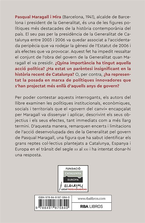 Pasqual Maragall i Mira (Barcelona, 1941), alcalde de Barcelona i president de la Generalitat, és una de les figures polítiques més destacades de la història contemporània del país. El seu pas per la presidència de la Generalitat de Catalunya entre 2003 i 2006 va quedar associat a l’accidentada peripècia que va rodejar la gènesi de l’Estatut de 2006 i als efectes que va provocar. Aquest fet ha impedit ressaltar el conjunt de l’obra del govern de la Generalitat quan Maragall el va presidir. ¿Quina importància ha tingut aquella acció política? ¿Ha estat un parèntesi insignificant en la història recent de Catalunya? O, per contra, ¿ha representat la posada en marxa de polítiques innovadores que s’han projectat més enllà d’aquells anys de govern?