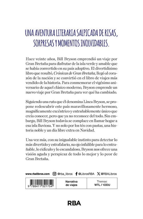 Hace veinte años, Bill Bryson emprendió un viaje por Gran Bretaña para disfrutar de la isla verde y amable que se había convertido en su país adoptivo. El divertidísimo libro que resultó, Crónicas de Gran Bretaña, llegó al corazón de la nación y se convirtió en el libro de viajes más vendido de la historia. Para conmemorar el vigésimo aniversario de aquel clásico moderno, Bryson emprende un nuevo viaje por Gran Bretaña para ver qué ha cambiado.