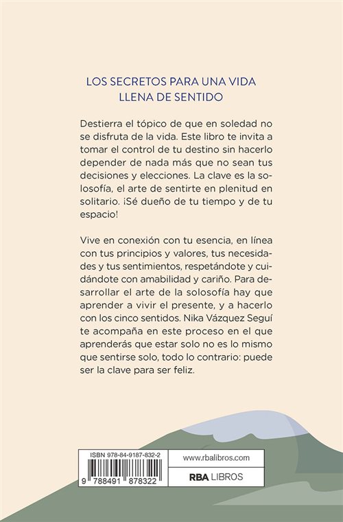 Vive en conexión con tu esencia, en línea con tus principios y valores, tus necesidades y tus sentimientos, respetándote y cuidándote con amabilidad y cariño. Para desarrollar el arte de la solosofía hay que aprender a vivir el presente, y a hacerlo con los cinco sentidos. Nika Vázquez te acompaña en este proceso en el que aprenderás que estar solo no es lo mismo que sentirse solo, todo lo contrario: puede ser la clave para ser feliz.