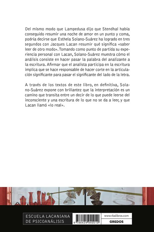 A través de los textos de este libro, en definitiva, Solano-Suárez expone con brillantez que la interpretación es un camino que transita entre un decir de lo que puede leerse del inconsciente y una escritura de lo que no se da a leer, y que Lacan llamó «lo real».