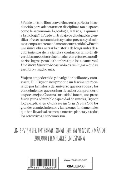 Viajero empedernido y divulgador brillante y entusiasta, Bill Bryson nos propone un fascinante recorrido por la historia del universo que nos rodea y los conocimientos que nos han llevado a comprenderlo un poco mejor. Con una curiosidad innata, una prosa fluida y una admirable capacidad de síntesis, Bryson logra explicar en Una breve historia de casi todo los grandes acontecimientos y las razones fundamentales que han llevado al cosmos, a nuestro planeta y a todos los seres vivos a ser como son.