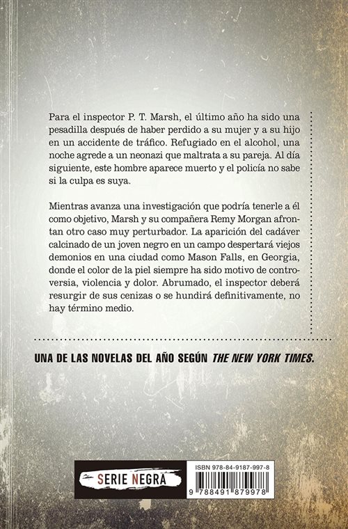 Mientras avanza una investigación que podría tenerle a él como objetivo, Marsh y su compañera Remy Morgan afrontan otro caso muy perturbador. La aparición del cadáver calcinado de un joven negro en un campo despertará viejos demonios en una ciudad como Mason Falls, en Georgia, donde el color de la piel siempre ha sido motivo de controversia, violencia y dolor. Abrumado, el inspector deberá resurgir de sus cenizas o se hundirá definitivamente, no hay término medio.